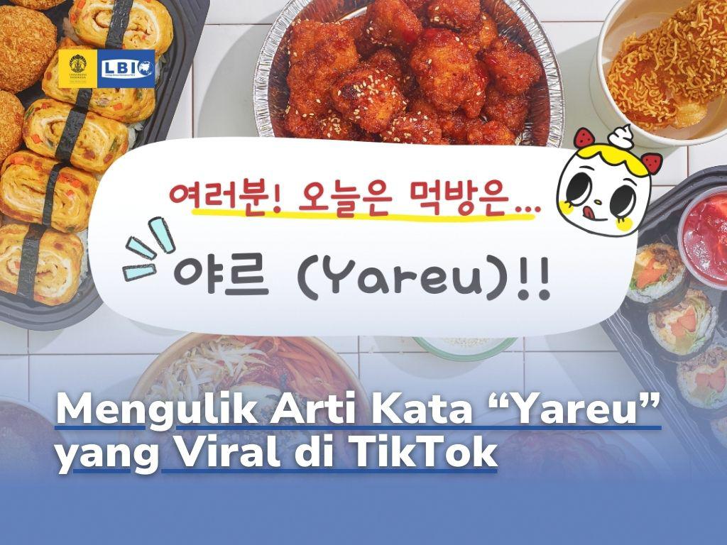 Apakah Sahabat LBI pernah mendengar kata “Yareu (야르)” yang sedang viral dan trending di TikTok? Kata sederhana ini cukup sering muncul dalam video mukbang Korea dan biasanya diucapkan dengan penuh ekspresi dan kedipan mata saat seseorang akan menyantap sebuah makanan. Sekilas terdengar lucu dan menghibur, tetapi apakah sebenarnya arti dan makna dari “Yareu”? Atau apakah kata ini hanya merupakan salah satu bahasa gaul (slang)? Yuk, kita ulik makna di balik kata “Yareu” dan bagaimana kata tersebut menjadi populer!